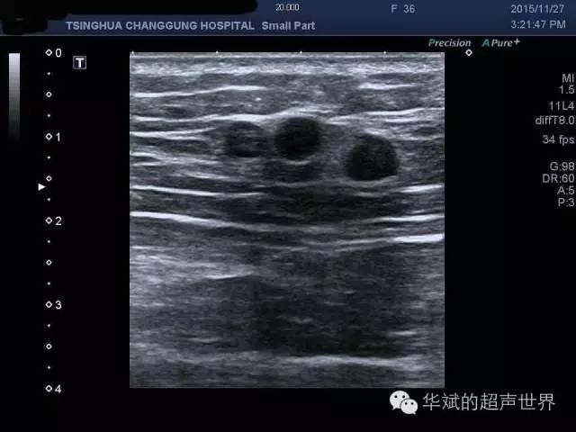 超声可见双侧臀部脂肪层内多发圆形无回声结节,边界清晰,后方无回声增强,具有典型的积油囊肿的特点。