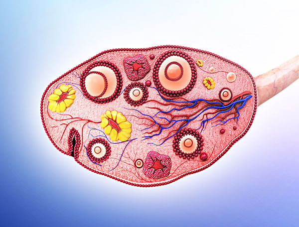 卵巢在脑垂体产生的卵泡刺激素(FSH)和黄体生成素(LH)的作用下,发生卵泡的生长、成熟和排出,同时分泌雌激素和孕激素,作用于子宫内膜,使子宫内膜周期性脱落和生长,形成月经周期。正因为卵巢正常的工作,女性才散发着魅力,才有规律的排卵和规律的月经,才能成功的怀孕。