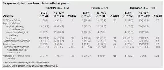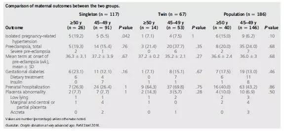 除了年龄较大组单胎妊娠孤立性妊娠相关高血压的风险要比年龄较小组高以外(19.2% vs. 5.5%, P=0.04),其他产妇并发症的风险两个年龄组之间差别不大,但是两组风险都很高,尤其是先兆子痫的发生风险(20% vs 24%)。