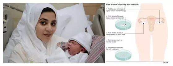 图1. 摘自BBC新闻网. 图1左是接受卵巢移植的患者及她的宝宝。图1右是治疗的大致流程:在患者9岁时,在接受化疗前将右侧卵巢去除并冷冻;15年后,将冷冻的卵巢移植到左侧卵巢上;术后患者的性激素水平恢复正常,并获得了8个成熟卵细胞进行体外受精。