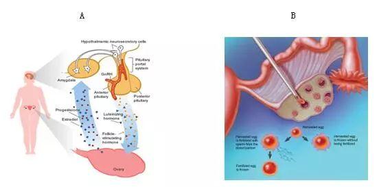 图2.OTC与卵细胞及胚胎冷冻比较(来自google图片)。图2A是指通过OTC技术,植入的卵巢组织不仅有成熟卵泡形成,还可以激活下丘脑-垂体-卵巢系统,产生性激素,调节女性内分泌系统;图2B是指传统冻卵、冻胚技术流程:将卵丘-卵母细胞复合物取出,进行冻存,如需要再进行体外受精成胚,因此,该技术没有保存卵巢功能的能力。
