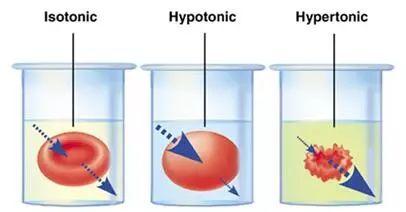 图3. OTC原理(来自google图片)。通常细胞处在等渗液中。当细胞外液渗透压低于细胞内液,则液体流向细胞内;当细胞外液的渗透压高于细胞内液,则液体从细胞内流出,使细胞皱缩。