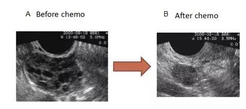 图4.化疗前后卵巢的超声对比图(图片来源:Claus Yding Andersen, Laboratory of reproductive biology,University of Copenhagen, Copenhagen, Denmark)。图4A是化疗前正常的卵巢超声图,卵巢大小正常,可见多个卵泡;图4B是化疗后的卵巢超声图,卵巢萎缩,未见卵泡。