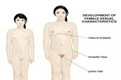 图5. 青春期第二性征发育(摘自google图片)。处在青春期女孩,其垂体分泌黄体生成素和卵泡刺激素,刺激位于下游的卵巢产生雌激素、孕激素、雄激素等性激素,从而完成第二性征的发育,比如规律月经、乳房和臀部发育、体毛生成等。