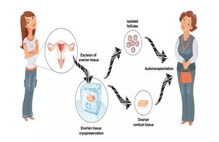 第三,有意愿延迟更年期年龄的女性。在西方国家,目前已有7500万女性进入绝经期;并有报道预计,目前出生的女婴中,将有半数以上的寿命超过100岁。这说明,随着老龄化的加剧及人们寿命的延长,越来越多的女性渴望延长生育期时间,以此保持青春、延缓衰老,同时可预防绝经后的并发症,比如心脏病、骨质疏松等。因此,有研究者认为,我们可以在女性年轻的时候冻存部分卵巢组织,并在她们即将进入更年期时再移植到体内,以此来延缓衰老,并防止绝经后并发症的发生(图6)。