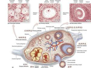 以人卵泡为例。原始卵泡(primordialfollicle)是由一个大的初级卵母细胞和其周围的单层扁平的卵泡细胞组成。新生儿卵巢皮质中约有100万个原始卵泡,但大多数不能达到成熟阶段,它们相继萎缩退化,形成闭锁卵泡。由原始卵泡发育成生长卵泡不需激素的调节。