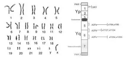 Y染色体是最小号的染色体,是决定男性之所以为男性的性别染色体,上面有决定睾丸发育和精子发生的基因。Y染色体是一条孤独的染色体,不像1~22号染色体那样可以配对重组;但这条“孤独的狼”有许多回文序列和重复序列,这些序列间发生的非等位同源重组的特点,被认为是导致Y染色体微缺失的主要机制。Y染色体微缺失根据在Y染色体的位置,进一步分为Y染色体近段、中段和远段缺失,分别称为AZFa、AZFb和AZFc缺失(如图)。