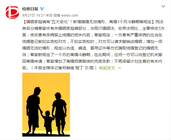 据检察日报报道,昨天(2018年8月28日)下午,民法典各分编草案提请第十三届全国人大常委会第五次会议审议。民法典各分编草案中有关婚姻家庭编部分,与现行婚姻法、收养法相比,主要修改5方面。我们关注的其中之一是“不再保留计划生育的有关内容”,计划生育问题,即出自民法典分编草案中的“婚姻家庭编”部分,这也就意味着,如果顺利过审,我国最快可能在2020年3月全面放开计划生育。现在社会还在广泛讨论今后生育自由,想生几个都行。