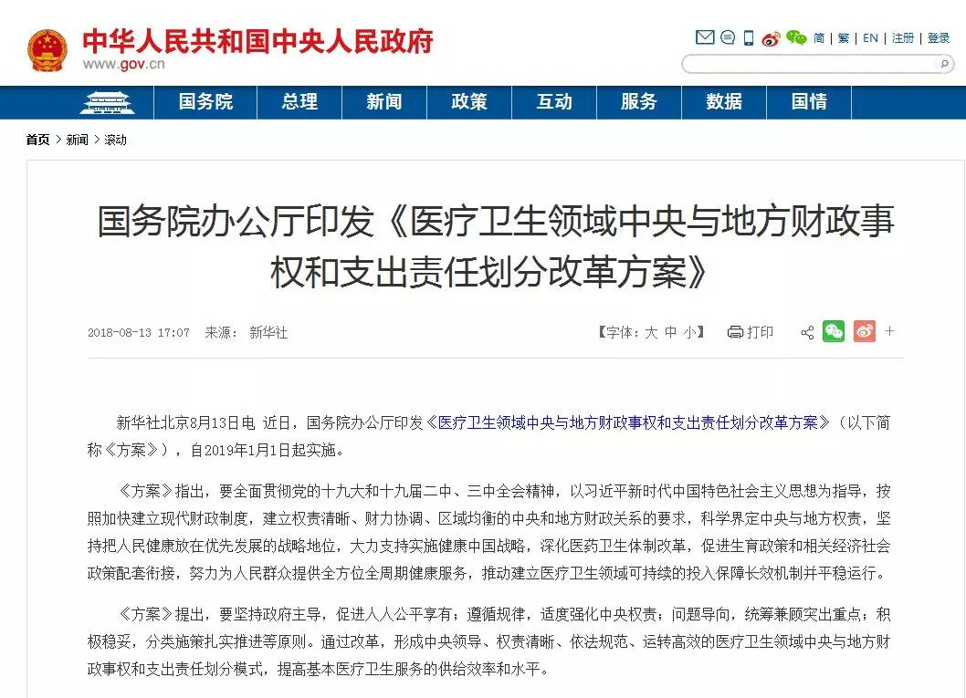 近日,中国政府网发布消息称,国务院办公厅印发《医疗卫生领域中央与地方财政事权和支出责任划分改革方案》 ,自2019年1月1日起实施。